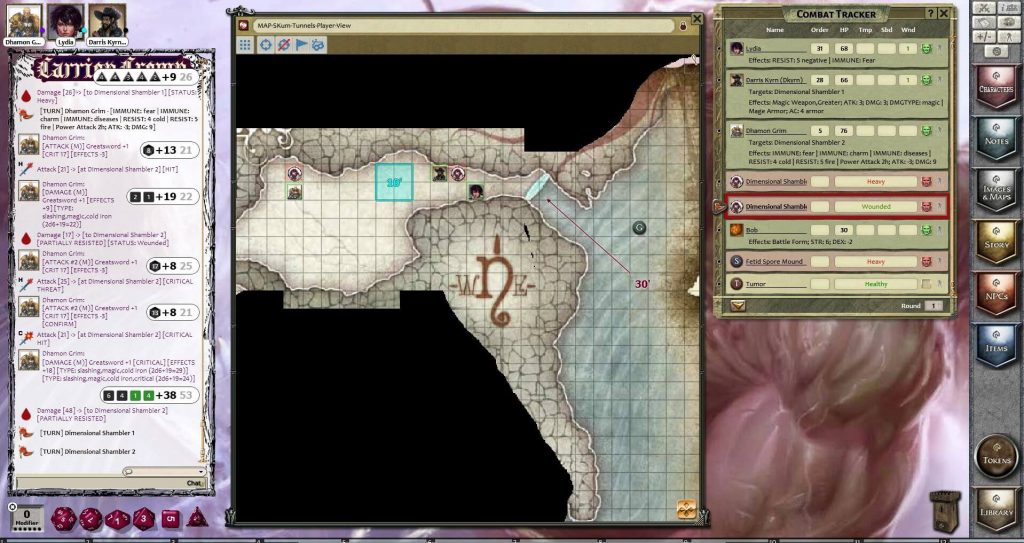 The party leaves the undead creation room and meets Invisible Stalkers before they head into the basement of the abbey. Upon entering the basement, they immediately encounter some Mohrgs and cult novices. Pushing deeper into the catacombs, they encounter two alchemical golems and Nalthezzar the lich.